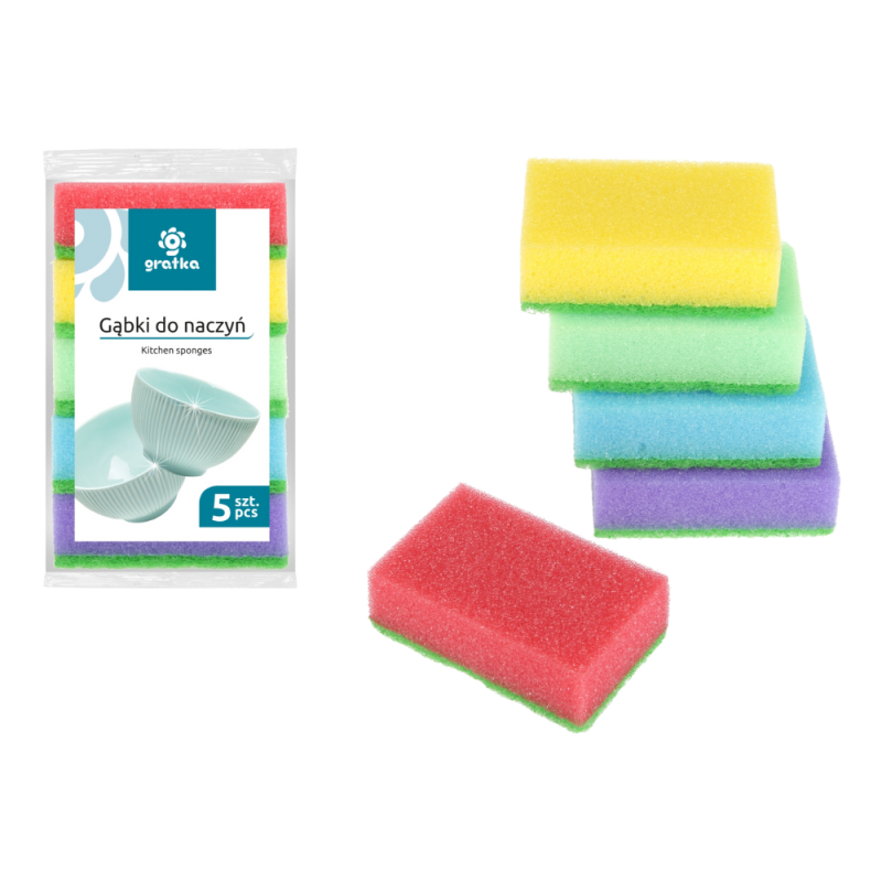 skuteczność w usuwaniu trudnych zabrudzeń. Zestaw składa się z 5 kolorowych gąbek do mycia naczyń.