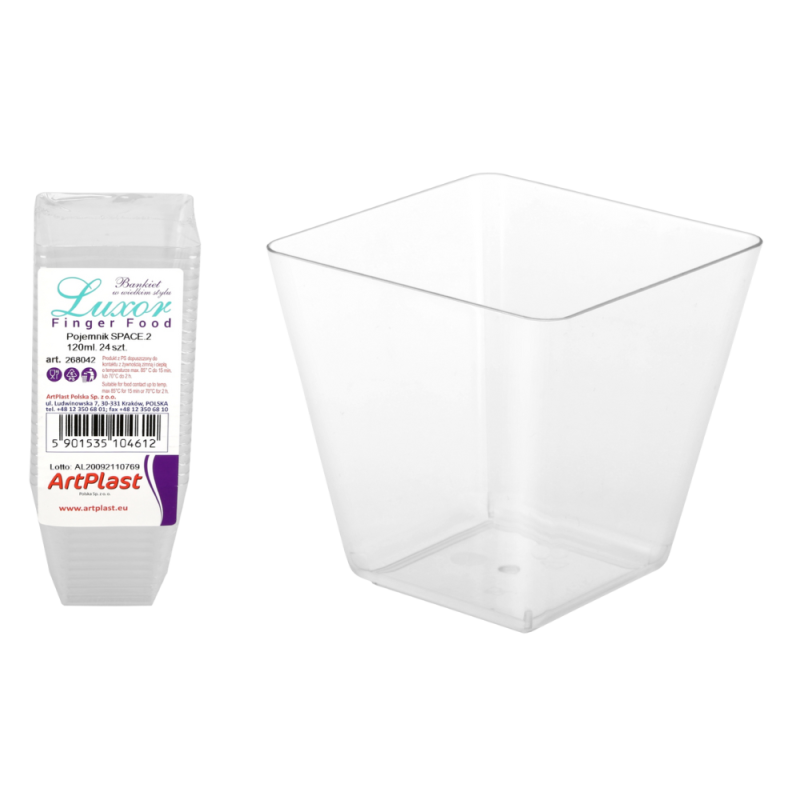 Pojemnik Space 2 wykonany z przeźroczystego przypominającego szkło tworzywa. Jednorazowy pojemnik do mini porcji przekąsek, deserów, sałatek. Idealne sprawdza się na przyjęcia biznesowe, eleganckie bankiety, wesela, degustacje, urodziny, catering czy urozmaicenie szwedzkiego stołu.