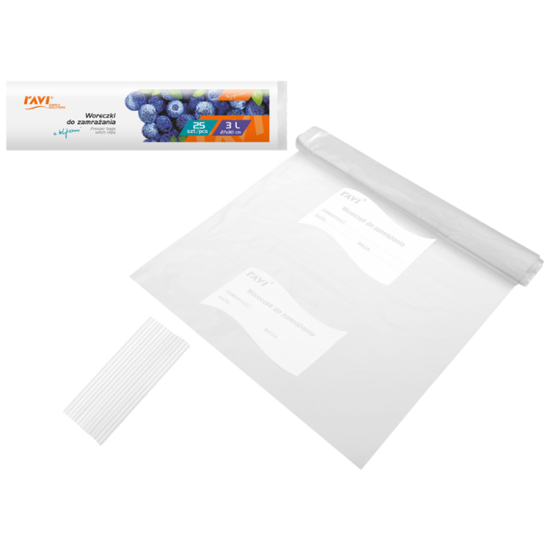Woreczki do zamrażania wykonane z wytrzymałej, nieprzepuszczającej zapachów i mrozoodpornej folii HDPE doskonale nadają się do przechowywania żywności w zamrażarce. Na każdym woreczku umieszczone jest białe pole na którym można zanotować informacje dotyczące zawartości oraz daty zamrożenia.