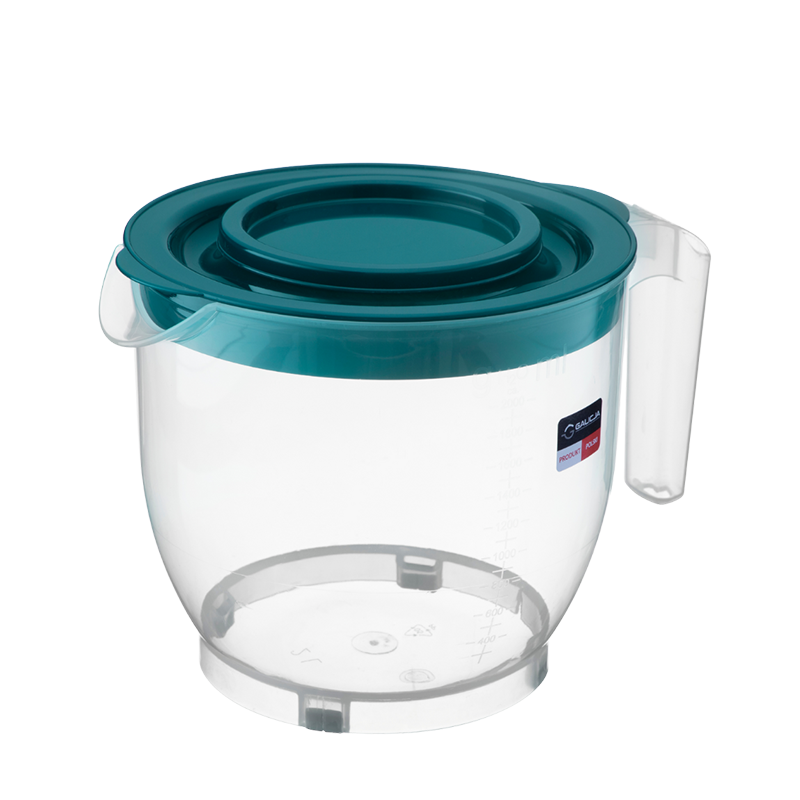 Dzbanek do miksowania to niezastąpione narzędzie w każdej kuchni. Wykonany z trwałego, transparentnego tworzywa sztucznego, pozwala na łatwe kontrolowanie procesu miksowania. Jego turkusowa pokrywka nie tylko dodaje estetycznego akcentu, ale także pełni praktyczną funkcję – można ją łatwo zdjąć, aby włożyć blender lub mikser. Dzięki specjalnej konstrukcji pokrywki masa podczas miksowania nie rozbryzguje się, co pomaga utrzymać kuchnię w czystości. Idealny do przygotowywania ciast, kremów czy koktajli, dzbanek ten łączy wygodę, funkcjonalność i nowoczesny design.
