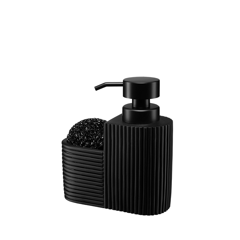 Stylowe elementy wyposażenia kuchni stają się coraz bardziej popularne - poza funkcjonalnością, powinny przykuwać wzrok swoim ciekawym designem. Linia akcesoriów kuchennych RIBBON to minimalistyczny, nowoczesny styl przełamany gładkimi, miękkimi krawędziami. Prezentowany dozownik RIBBON został wykonany z trwałego materiału o nazwie poliresin. Cechuje się on dużą plastycznością i wytrzymałością. Dozownik kuchenny RIBBON jest bardzo funkcjonalnym produktem. Posiada masywną, wygodną w użytkowaniu pompkę dozującą płyn do mycia naczyń oraz miejsce do przechowywania kuchennej gąbki, która znajduje się w zestawie. Czarny kolor wykonania pięknie uzupełnia się z nowoczesnymi dodatkami. Dozownik jest masywny i stabilnie leży przy kuchennym zlewie. Posiada stylowe, podłużne wgłębienia, które świetnie wpasowują się w obecne trendy wyposażenia wnętrz.