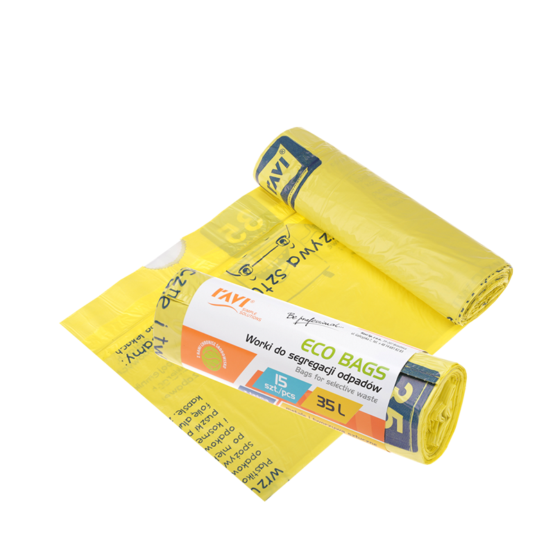 Worki do segregacji odpadów ECO BAGS są wykonane z bardzo praktyczną i wygodną taśmą do wiązania i przenoszenia worka. Są produktem służącym do pomocy podczas domowej segregacji odpadów. Żółte worki są przeznaczone do wrzucania do nich metali i różnego rodzaju tworzyw sztucznych. Worki ECO BAGS są przyjazne dla środowiska, a ich pojemność 35L jest w użytkowym rozmiarze. Worki są sprzedawane po 15 sztuk.