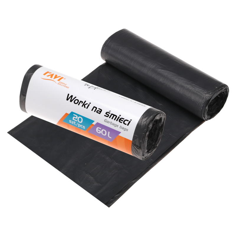 Bardzo praktyczne i wygodne w użytkowaniu czarne worki na śmieci to niezbędny element wyposażenia każdego domu. Zostały wykonane z folii HDPE pochodzącej z recyklingu. Są w pojemności 60L. Worki zostały wyprodukowane w Polsce, a w rolce znajduje się 20 sztuk.